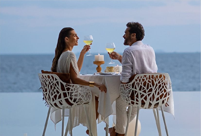 在我们的每家餐厅、⽆边泳池旁、舒适的⻆落或私⼈沙洲上的星空下,享受更多私⼈定制的迷⼈盛宴。